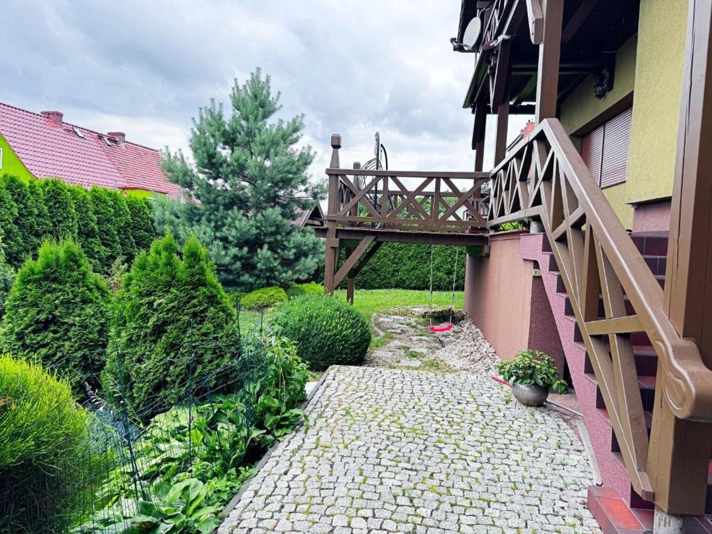 Dom znajduje się w malowniczej i spokojnej okolicy, otoczonej zabudową jednorodzinną, co sprzyja relaksowi i odpoczynkowi. W sąsiedztwie można spotkać przyjaznych sąsiadów, co tworzy miłą atmosferę oraz poczucie bezpieczeństwa. Okolica charakteryzuje się zielenią – w pobliżu znajdują się parki oraz tereny rekreacyjne, idealne do spacerów, joggingu czy rodzinnych pikników.